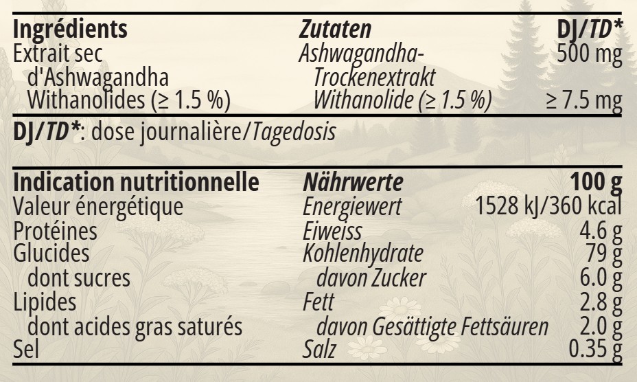 • Extrait sec d’Ashwagandha (Withania somnifera, racine) : Concentré végétal qui soutient la capacité d’adaptation de l’organisme. Il participe à l’équilibre nerveux et favorise les fonctions de relaxation nécessaires à l’harmonie du corps et de l’esprit.