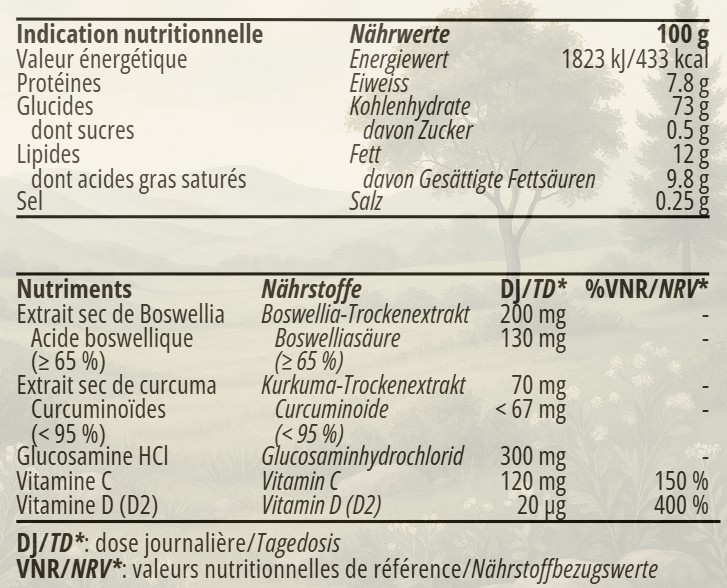 Extrait sec de Boswellia (65% d’acide boswellique) : Participe au soutien du confort articulaire et aide à maintenir la souplesse des articulations.
