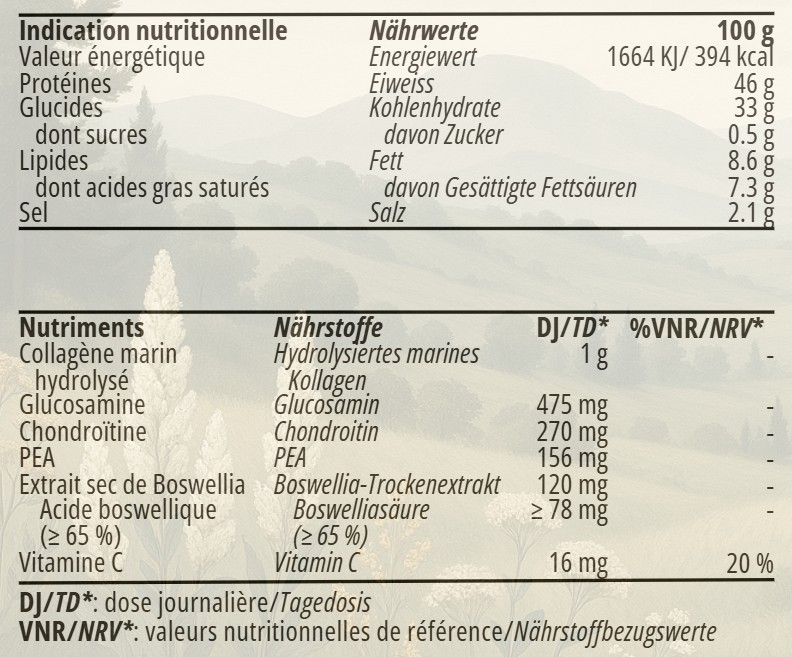 Pour renforcer cette action, nous avons intégré une synergie de molécules fondamentales : la glucosamine et le sulfate de chondroïtine. Ces constituants naturels de la matrice extracellulaire travaillent de concert pour soutenir la densité et la souplesse des Articulations. L’ajout de PEA (palmitoyléthanolamide), ainsi que d’un extrait de Boswellia titré en acides boswelliques, apporte une dimension de confort et de Résilience face aux sollicitations physiques quotidiennes.