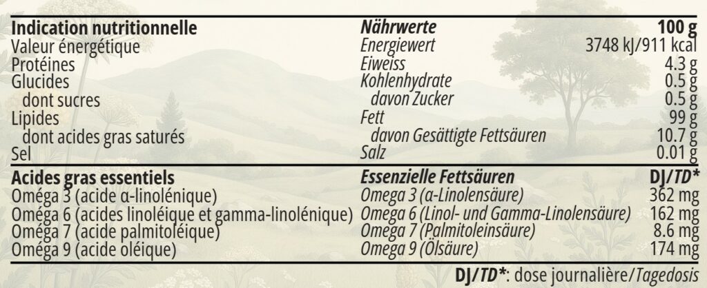 • Huile de lin (Linum usitatissimum L.) : Source majeure d’acide alpha-linolénique (Omega 3) soutenant la structure des membranes cellulaires.