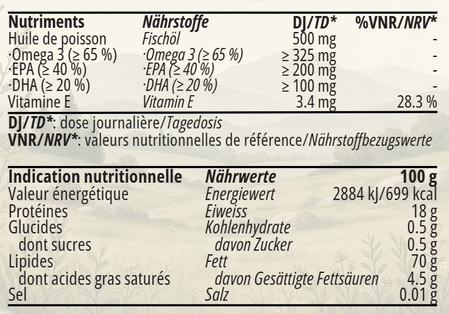 Huile de poisson (500 mg par capsule) : Source marine hautement purifiée fournissant un spectre complet d’acides gras polyinsaturés.